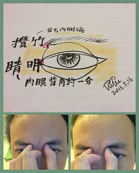 攢竹:足太陽膀胱經(1)兩眉頭陷中,眉毛內側端有陷凹處,輕按即有痛痠。(2)明眼目、鼻鼽衂、目眩、風眩、額神經痛、腦昏目赤。(3)古書:攢竹頭維治目疼頭痛(玉龍賦)